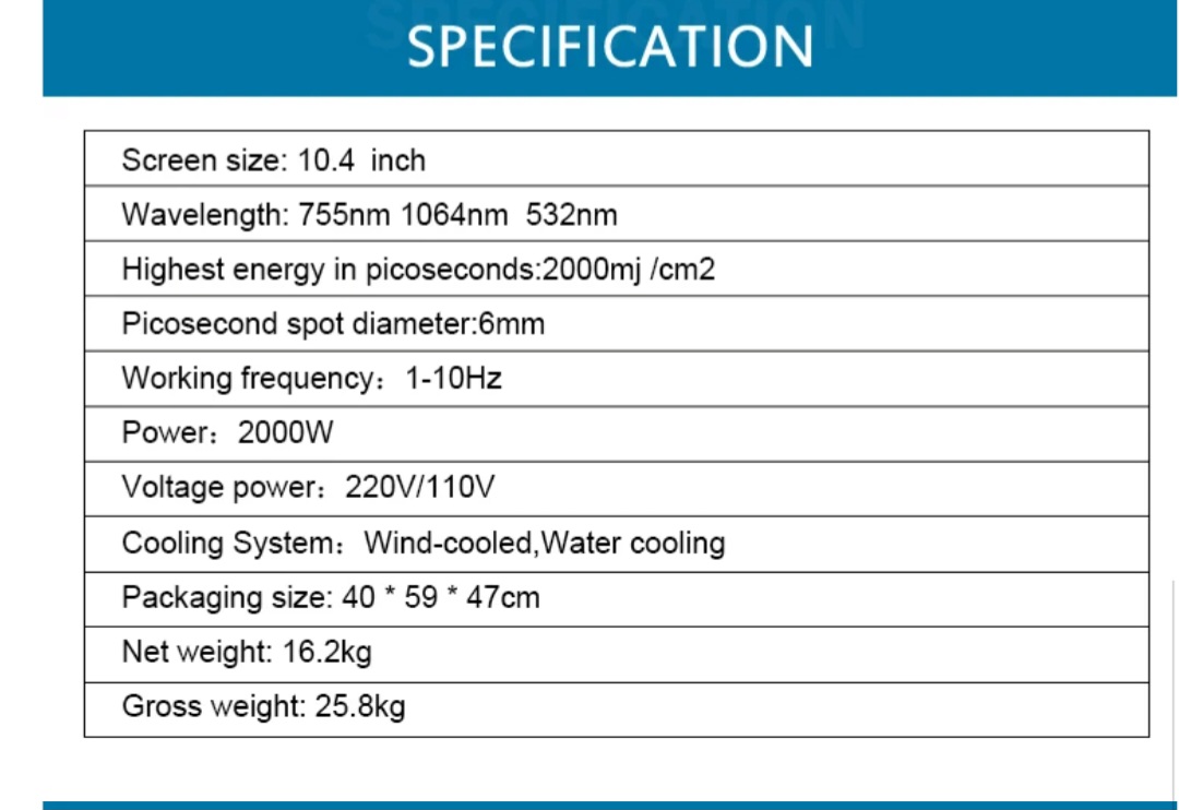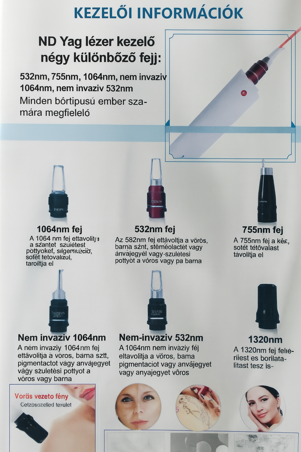 -1064 nm: Alkalmas egyszínű tetoválások, szemöldöktetoválások, fekete és kék ajkak, szemhéj és traumatizált bőr helyrehozasara a színek eltávolítására.